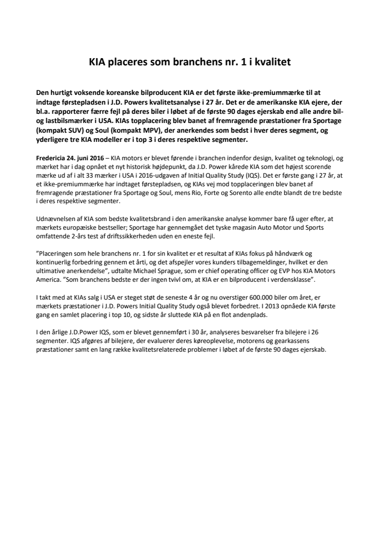 KIA er det første ikke-premiummærke til at indtage førstepladsen i J.D. Powers kvalitetsanalyse i 27 år. Det er de amerikanske KIA ejeres oplevelse af bilen, der er bedre end alle andre bilmærker i USA. KIAs topplacering blev banet af fremragende præstationer fra Sportage og Soul, der anerkendes som bedst i hver deres segment, og yderligere 3 KIA modeller er i top 3 i deres respektive segmenter.