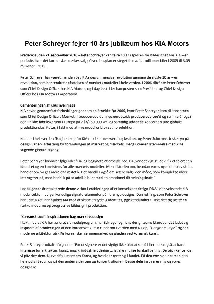 Peter Schreyer har været manden bag KIAs designmæssige revolution gennem de sidste 10 år – en revolution, som har ændret opfattelsen af mærkets modeller i hele verden. I år kan Peter Schreyer fejre 10 år i spidsen for bildesignet hos KIA – en periode, hvor det koreanske mærkes salg på verdensplan er steget fra ca. 1,1 millioner biler i 2005 til 3,05 millioner i 2015.