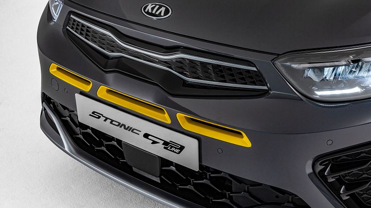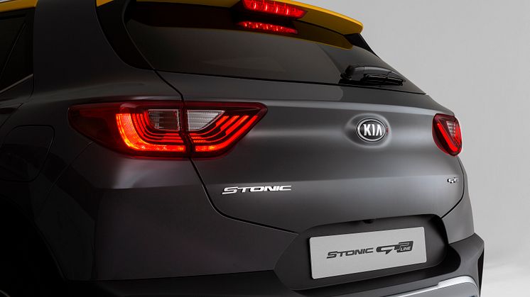 Dette manifesterer sig i nyt front- og bagkofangerdesign for en mere målrettet attitude på vejen. Den forreste kofanger er forbedret med integrerede LED-tågelygter, tre forskellige luftindtag på tværs af bilens forside og en metallisk linie langs den nederste kant. Tiger-næse-grillen får også sin egen unikke designfinish, mens sorte sidespejle står i kontrast. Desuden er GT Line-modellen som standard udstyret med nye komplette LED-forlygter, der skaber en markant lyssignatur. Bagpå adskiller en mere fremtrædende bagkofanger den fra andre Stonic-varianter med et design, der efterligner dobbelt udstødning og en bagdiffusor og et GT Line-mærke på bagklappen.