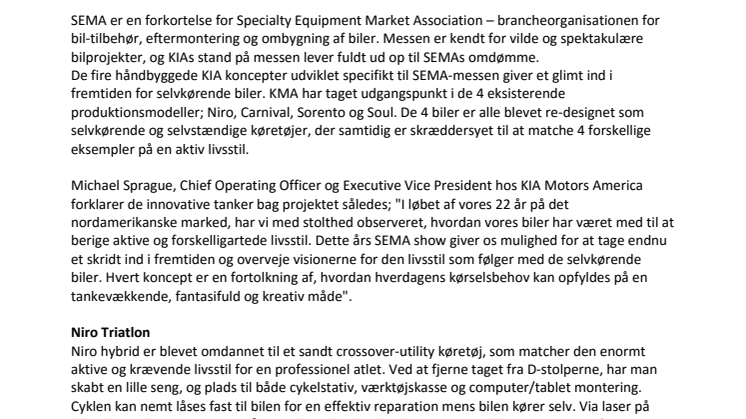 De fire håndbyggede KIA koncepter udviklet specifikt til SEMA-messen giver et glimt ind i fremtiden for selvkørende biler. KMA har taget udgangspunkt i de 4 eksisterende produktionsmodeller; Niro, Carnival, Sorento og Soul. De 4 biler er alle blevet re-designet som selvkørende og selvstændige køretøjer, der samtidig er skræddersyet til at matche 4 forskellige eksempler på en aktiv livsstil.