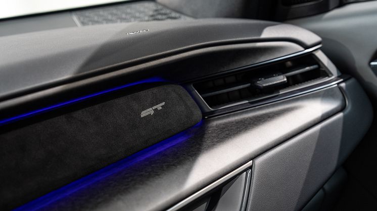 Kabinen byder på mørkegrå og sort vegansk læder kombineret med alcantara og neon-grønne detaljer. Med en eksklusiv GT-knap på rattet kan føreren aktivere GT Mode og opleve bilens fulde præstationspotentiale.