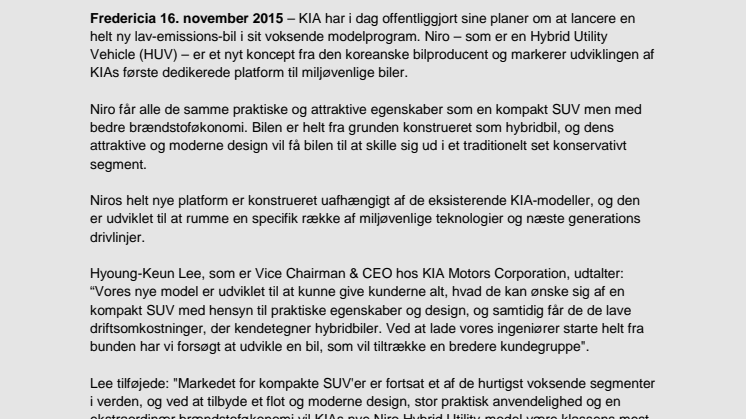 KIA har i dag offentliggjort sine planer om at lancere en helt ny lav-emissions-bil i sit voksende modelprogram. Niro – som er en Hybrid Utility Vehicle (HUV) – er et nyt koncept fra den koreanske bilproducent og markerer udviklingen af KIAs første dedikerede platform til miljøvenlige biler.
