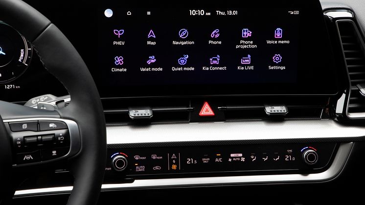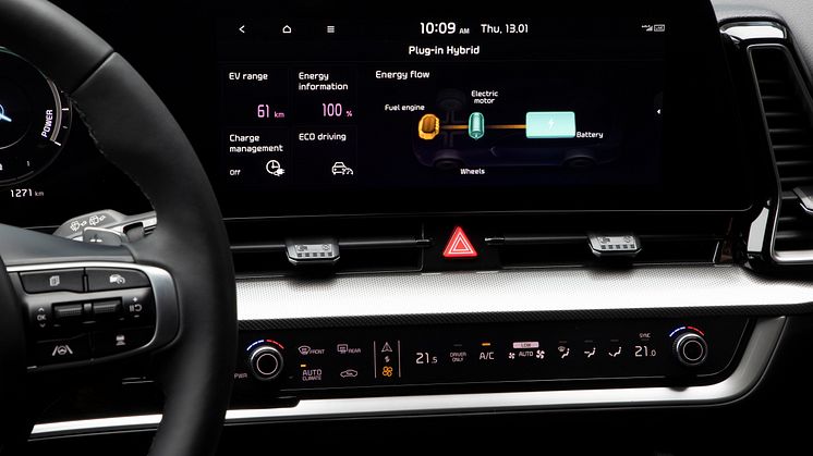 Som det er tilfældet med resten af Sportage-modelprogrammet, er kabinen i Plug-in Hybrid omhyggeligt designet til at kombinere banebrydende teknologi med luksusudstyr, førsteklasses materialer og moderne stil. En 12,3” hightech-touchskærm og et multifunktions-touchdisplay, som er nervecentret for førerens og passagerernes opkoblingsmuligheder, funktioner og nyttige features, og en 12,3” instrumentenhed viser alle vigtige kørselsinformationer i knivskarp grafik.