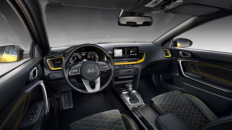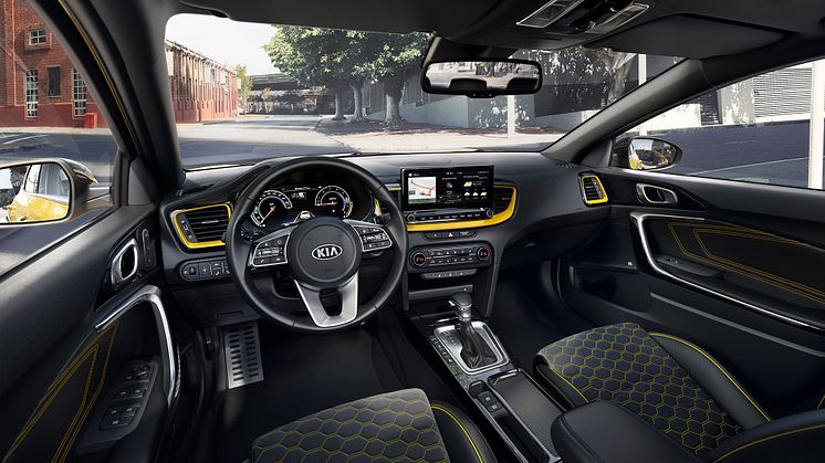 Som noget unikt for KIA XCeed fås en ny gul interiørpakke. Pakken indeholder sort indtræk med livlige gule syninger på sæder og døre, gule kantbånd på sæderne og en kombination af sort højglans og gul metallak rundt om i kabinen.