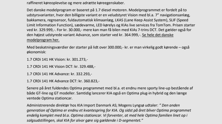 Administrerende direktør hos KIA Import Danmark AS; Mogens Lyngsø udtaler: ” Den anden generation af Optima er endnu et kvantespring for KIA. Og sidst på året bliver Optima programmet endelig komplet med bl.a. Optima stationcar. Vi forventer, at med hele Optima familien linet op i salgsudstillingen, skal KIA for alvor gøre sig gældende i D-segmentet.”
